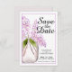 Donnez à vos invités un préavis de vos plans de mariage avec cette belle carte Save the Date. Il présente une aquarelle rustique de lilas dans un bocal en verre. Le fond est doté d'un bouquet chic boho de fleurs lilas attachées avec un arc blanc sur un arrière - plan violet clair.