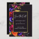 Des couleurs et une calligraphie audacieuses et magnifiques créent une carte de Save the Date dramatique. Des roses rouges bourgogne et orange brûlé se mélangent avec des fleurs violettes. Toutes nichées dans un feuillage d'olive profond. Les informations sur la date de votre mariage sont écrites en blanc et ressortent vraiment sur le fond noir. Un cadre rectangulaire doré et scintillant entoure les détails.