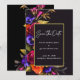 Des couleurs et une calligraphie audacieuses et magnifiques créent une carte 'Save the Date' spectaculaire. Des roses rouges bourgogne et orange brûlé se mélangent avec des fleurs violettes. Toutes nichées dans un feuillage vert olive foncé. Les informations sur la date de votre mariage sont écrites en blanc et ressortent vraiment sur le fond noir. Un cadre rectangulaire doré et scintillant entoure les détails.