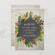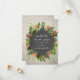 Une élégante invitation de réponse de mariage présentant un design géométrique inspiré d'un tableau noir entouré de verdure tropicale sur un fond de brique blanche.