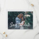 Un moderne enregistrer la carte de date avec "enregistrer la date" dans un style de typographie manuscrite frais et décontracté qui évoque l'apparence d'un marqueur de brosse. Conçu pour s'adapter à votre photo fiançailles horizontale ou paysagère préférée, cette carte chic est dotée d'une superposition de texte blanc avec vos noms, date mariage et emplacement mariage. Les cartes retournent à un motif ikat subtil avec de l'espace pour inclure votre URL de site mariage ou toute information supplémentaire que vous choisissez.