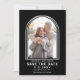 Stylish simple modern chic minimalist monogram black with white Save the Date Flat Card is ideal for black and white elegant weddings. The double arch represents two persons becoming one in their life together. This design includes two photos, one on each side and has your wedding website address and qr code on the back side. You can easily personalize this template online with our easy online customization tool.