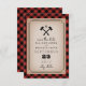 Un mariage élégant et rustique sauve l'invitation de la date avec un arrière - plan en plaid de buffle et un design de hache monogramme.