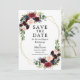 Elégante aquarelle Bourgogne Floral Enregistrer la date Faire-part Mariage La carte comprend des roses bordeaux, des fleurs bleues, des roses roses, des fleurs rouges et de la verdure sur un cadre géométrique doré.