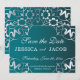 Modèle personnalisable de faire-part de mariage avec un cadre en filigrane argenté découpé au laser sur fond dégradé sarcelle. Le texte est entièrement personnalisable.