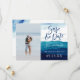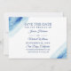 Calligraphie moderne et amusante Sauvez la Date avec des vagues et lavages aquarelle, avec de belles nuances de bleu marine, bleu profond, bleu clair. L'oeuvre ressemble à des vagues océaniques ou à des montagnes. Taches d'aquarelle bleu clair mignonnes sur le côté arrière.