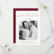 Ce simple mariage Save the Date présente une belle calligraphie couleur or et un cadre photo sur le devant avec un solide dossier rouge bordeaux.