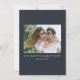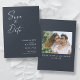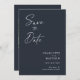 Moderne, minimaliste et élégant "Save The Date" cartes photos fiançailles mariages. Ce design personnalisé comprend des éléments de texte moderne avec un script d'encre de calligraphie unique. La photo de couple met en évidence le dos de la carte. Les couleurs sont blanches sur ardoise bleue ou customisent facilement la couleur de base si nécessaire.