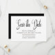 Design élégant et intemporel noir et blanc. Save the Date est écrit dans un texte de script magnifique. Vous trouverez ci-dessous vos noms, votre date de mariage et votre emplacement. Vous pouvez inclure un message supplémentaire au verso.