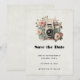Save the date card with a vintage styled camera decorated with flowers. Pastel colors of pink, cream and green.