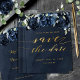Un mariage bleu marine Enregistrer la carte Date avec des pivoines navales en cascade au milieu d'un bleu argenté poussiéreux sur un arrière - plan couleur marine foncé avec une police de calligraphie époustouflante disant, "Sauvez la date", dans une écriture dorée chatoyante.