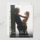 Cette photo de carte de changement de date de mariage moderne présente une photo saignante recouverte d'un script changeant la date au-dessus de vos noms et message en texte blanc.
