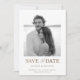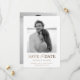 Vous aimerez cette carte unique et élégante, avec une photo classique en noir et blanc encadrée par un arrière - plan blanc immaculé. Le texte "Save the Date" est mis en surbrillance dans un or métallique faux luxueux, ajoutant une touche de sophistication et d'élégance au design. Parfait pour les couples à la recherche d'une esthétique moderne et intemporelle, cette carte est facilement personnalisable avec vos photos et détails mariages, ce qui en fait un souvenir inoubliable pour vos invités.