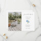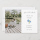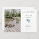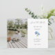 Cette belle carte, oh si chic et minimaliste, mariage blanc "Save The Date" présente une photo de couple, un design hydrangea bleu floral, texte de script de brosse élégant, date et adresse de l'événement, ainsi qu'un ensemble de polices contemporaines. Jeune et tendance, cette carte horizontale donne un ton joyeux.
