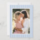 Announce your wedding with this classic blue hydrangea photo save the date card, designed for couples who love timeless and traditional wedding stationery. This elegant save the date features a hand-drawn hydrangea illustration at the top, paired with graceful calligraphy and refined serif typography for a polished, formal look. The back showcases your vertical engagement photo set against a crisp blue and white striped background, creating a tailored and coordinated presentation. The soft blue color palette feels calm and sophisticated, making this design perfect for garden weddings, estate celebrations, church ceremonies, and classic venues. Personalize the wording and photo to create a cohesive save the date that introduces your wedding style while beautifully coordinating with your invitation suite.