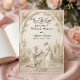 Announce your formal estate union with a romantic neo-classical design featuring a proposal scene and soft botanical accents in a timeless monochrome palette.This design features a highly detailed digital illustration simulating a 3D bas-relief stone carving. The central image depicts a romantic engagement scene where a gentleman kneels to propose to a lady in a flowing gown, set within a classical rotunda temple architecture. The "carved" stone elements are rendered in shades of beige, cream, and warm grey, contrasted by flat-printed pastel pink and peach roses with muted sage green leaves climbing the arched frame. The typography combines an elegant, ornate black calligraphy script for names with a traditional serif font for the details.This is a flat printed image with a Faux Stone Embossed effect, not actual raised material or textured paper.
