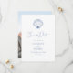 Ce mariage de plage bleu côtier sauf la carte de date a une coquille de pétoncle avec les initiales monogrammes de la mariée et du marié, et un modèle photo sur le dos.