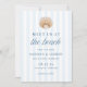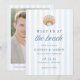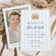 Announce your wedding with coastal style using this Coastal Blue Stripe Shell Beach Wedding Save the Date, featuring a watercolor shell at the top of the design. Soft blue vertical stripes create a light and airy background, while “Meet us at the beach” is displayed in elegant navy serif and script lettering for a polished and inviting focal point. Your names, wedding date, and location are arranged below in a clean, well-balanced layout that keeps the design easy to read. The back of the card features a vertical engagement photo with your wedding website displayed beneath, set against the coordinating striped background for a cohesive look. Ideal for beach weddings, destination weddings, and oceanfront venues, this save the date offers a timeless design with a relaxed seaside feel.