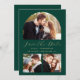 Cette simple et minimaliste carte Save the Date comporte une arche photo personnalisée au-dessus des mots "Save the Date" dans un élégant script d'écriture dorée, suivi des noms du couple, date mariage et ville en sans serif police sur un arrière - plan vert émeraude. Deux photos carrés plus petites apparaissent au bas de la carte. Ajoutez un message plus détaillé avec des informations supplémentaires au verso, ainsi qu'un code QR pour aider vos invités à visiter votre site Web mariage.
