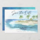 Modern Tropical Ocean Beach Script Enregistrer la date Annonce Mariage Faire-part - Annoncez votre date de mariage avec notre faire-part d'invitation à la plage d'aquarelle élégante avec une magnifique aquarelle scène de plage tropicale. Une plage de sable chaud avec une eau turquoise et des palmiers décorés de lampes à cordes avec typographie moderne. Inclut le code QR pour vous permettre de customiser avec votre URL de site mariage.