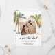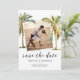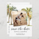 Cartes de sauvegarde de date de destination d'été ! Conçues avec un simple fond blanc, 2 photos des mariés, des palmiers aquarelles tropicaux, un code QR (remplacez-le par le vôtre) et un modèle élégant facile à personnaliser.