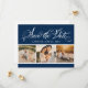 Style vintage personnalisé bleu marine et blanc (note, la couleur arrière - plan peut être modifiée) mariage enregistrer la fonction de cartes de date "Enregistrer la date" dans un élégant style de script de calligraphie manuscrit, trois (3) espaces pour les photos fiançailles (conseil : rogner à la forme carré avant de télécharger), et du texte sur le dos qui peut être personnalisé avec des informations mariage.