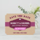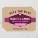 Élégant rétro enregistrer la carte de date avec le design pourpre. Personnalisez ce faire-part en ajoutant vos propres détails personnalisés.