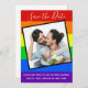 Cette carte Save the Date arc-en-ciel audacieuse comporte une photo d'engagement romantique LGBTQ personnalisée pour un couple homosexuel ou lesbien qui aime les annonces lumineuses et colorées. Personnalisez cette carte de photographie Save the Date LGBT joyeuse avec vos noms, date et lieu.