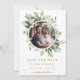 Cette invitation de mariage photo à conserver présente de la verdure d'eucalyptus aquarelle peinte, des feuilles vertes et un cadre de cercle doré. Pour une personnalisation plus avancée de ce design, veuillez cliquer sur le lien "Personnaliser davantage". Des articles assortis sont également disponibles.