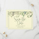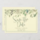 Moderne Enregistrer la Date annonces comprennent aquarelle aquarelle d'eucalyptus feuille bordure sur arrière - plan crème avec des blocs de texte personnalisables en vert dans les polices modernes. Ajoutez le code QR du site de mariage personnalisé à l'arrière.