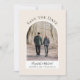 Moderne enregistrez la carte d'annonce de date avec votre photo dans un cadre d'image en arc contre un arrière - plan crème légère. Vous pouvez personnaliser l'accueil "enregistrer la date" dans la typographie moderne et vos noms dans une police de script tendance.