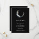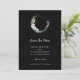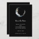 Enregistrez la carte de date avec une illustration mystique. Une lune bleu foncé avec un contour élégant en cercle mince et des fleurs blanches fleurissent le long de ses bords.