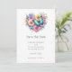 Save the date card with a beautiful illustration. A heart-shaped bouquet of flowers in pastel blue, green, purple and yellow. With a lovely blue butterfly hovering in front.