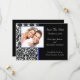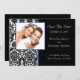 Annoncez votre futur mariage avec nos cartes d'annonce Save The Date avec un magnifique motif damassé noir & blanc avec un cadre photo découpé bleu foncé. Ajoutez simplement vos informations de mariage et votre photo et vous êtes tous prêts à partir ! Correspondance des timbres-poste et des scellés d'enveloppe disponibles dans notre boutique
