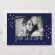 Ce mariage élégant sauvez la carte date dispose d'une typographie moderne en argent et des accents avec votre photo personnelle préférée, sur un arrière - plan bleu marine foncé.