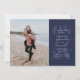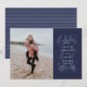 Avec une date en gras dans une couleur bleu marine et beaucoup d'espace pour le texte personnalisé avec tous les détails de votre mariage, cela enregistrer la carte de date a également un endroit pour une seule photo fiançailles vertical. Le dos est une couleur bleu marine coordonnée avec des rayures.