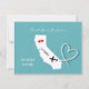 Une invitation à sauvegarder amusante pour les couples qui se marient en Californie, avec une silhouette blanche de la carte de Californie sur fond sarcelle avec de doux cœurs d'amour rouges et si facile à personnaliser avec vos noms et message personnels