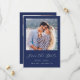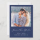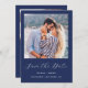 Cette simple et minimaliste carte Save the Date présente une photo carré au-dessus des mots "Save the Date" dans un élégant script d'écriture manuscrite blanche, suivie des noms du couple, de la date du mariage et de la ville en sans serif police sur un arrière - plan bleu marine. Ajoutez une seconde photo horizontale et un message plus détaillé avec des informations supplémentaires sur l'inverse.