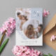 Carte de sauvegarde à double face à la date en blanc et en bleu colomb avec vos initiales, des photos qui se chevauchent et de la verdure avec des polices propres et élégantes. Carte de sauvegarde de photo avec un design moderne personnalisé avec votre monogramme et des photos, deux d'un côté et un de l'autre.