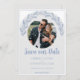 Cette Garland Photo Save the Date Annonce est livré avec un design de texte simple, un élégant garland de feuillage dans une boîte à contour moderne en attendant votre photo et vos détails mariages pour customiser contre un arrière - plan d'arche gris clair.
