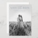 Moderne et élégant, enregistrez la carte datant présente un design minimaliste bleu et blanc poussiéreux. Personnalisez avec vos détails de mariage avec le modèle facile à éditer avec une police de script élégante et une police serif classe. Remplacez la photo complète à l'avant par la vôtre par l'option de retirer le filtre noir et blanc. Ensuite, remplacez la photo arrière par la vôtre et mettez à jour l'URL de votre site mariage. Découvrez les objets correspondants dans la collection "Modern Elegant".