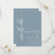 Ce bleu poussiéreux sauve la carte date dispose d'une police script moderne qui ajoute une touche d'élégance intemporelle. Le design minimaliste garde l'accent sur vos noms et votre date de mariage, en faisant une déclaration claire et élégante. Parfait pour toutes les saisons, cette carte polyvalente complète une variété de thèmes mariages, du romantique et chic au moderne et sophistiqué. Personnalisez-le avec vos noms et votre date de mariage pour une sauvegarde de la date qui reflète votre style unique.