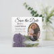Ces belles fleurs modernes sauvent les cartes datées sont la façon parfaite de faire connaître à vos amis et votre famille votre prochain mariage. Elles présentent un design élégant avec un seul rose à long tige poussiéreux pourpre ou lavande réfléchissant dans un bassin d'eau avec des vagues et ondulant avec votre photo dans un cadre ovale sur un arrière - plan blanc classique. La légende indique Enregistrer la date avec de l'espace pour vos noms, la date et l'emplacement. Le dos est marbré violet gris.