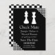 Mariage noir et blanc Enregistrer la date faire-part fait dans un jeu d'échecs thème. Les silhouettes d'une pièce blanche d'échecs Queen et King décorent le haut de la faire-part noire, les coins supérieur droit et inférieur gauche se faisant dans un damier noir et blanc. Le texte en blanc est prêt à être personnalisé avec vos informations de mariage. Grand faire-part pour le couple amoureux des échecs.