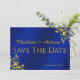 Cartes de save the date de style élégant avec fleurs dorées jaunes et bleu royal. Personnalisez avec vos propres noms et date spéciale.