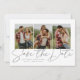 Avec trois photos verticales et un script moderne écrit "enregistrer la date", cette carte est le moyen idéal pour annoncer votre fiançailles et le prochain mariage à vos amis et votre famille. Le texte gris chic est audacieux et moderne mais toujours sophistiqué. Le texte personnalisable sur le devant a de la place pour les noms, la date, l'emplacement et d'autres informations comme un site Web mariage. Le dos est un motif rayé gris et blanc neutre. La couleur est modifiable en cliquant sur "Personnaliser".