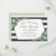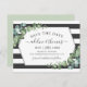 Annoncez votre mariage dans le style avec ces élégantes cartes d'annonce de date avec un beau design typographique encadré par un cadre géométrique hexagone moderne et un design vert aquarelle organique qui est parfait pour un événement de printemps ou d'été avec le feuillage d'eucalyptus et des branches d'eucalyptus en argent dollar dans des tons doux verdoyants de menthe, vert, olive et vert muet. Des rayures horizontales en noir et blanc gras accentuent le design. La couleur arrière - plan verte souple de coordination au dos de la carte peut être modifiée en blanc ou en une autre couleur par Personnaliser.
