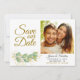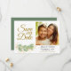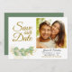 Elégant eucalyptus Enregistrer la carte Date avec photo personnalisée, les noms et la date. Le côté arrière est vert sage, mais vous pouvez le changer en blanc ou une autre couleur avant de commander.