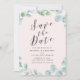 Moderne enregistrer la date avec "Save the Date" affiché dans un script de calligraphie gris foncé avec un arrière - plan rose clair. Une couronne de feuilles d'eucalyptus aquarelle dans plusieurs tons de vert entoure vos noms, date mariage, emplacement mariage, etc. L'eucalyptus enregistre la date inverse pour afficher un arrière - plan vert sage avec de l'espace pour les photos et le texte supplémentaire.