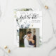 Cette invitation à la date comprend des arrangements feuilles de verdure aquarelle élégante et de belle calligraphie et simple police de typographie serif avec un cadre photo carré sur un arrière - plan blanc et code QR pour un look épuré minimaliste et moderne, ce qui est une belle façon d'informer sur votre mariage à venir. Annoncez à votre famille et à vos amis que vous vous mariez avec cette invitation et ajoutez une touche personnelle avec de belles photos de vous et votre moitié future meilleure. La simplicité de ce design ajoute une touche d'élégance à votre mariage. Il fonctionne bien avec de nombreux thèmes mariages et certainement un grand ajout à votre mariage. Il suffit de customiser les noms et le libellé en quelques étapes simples et personnaliser la carte d'invitation avec votre photo du couple heureux et remplacer le code QR par le vôtre. Veuillez noter : La calligraphie élégante de la formulation "Enregistrer la date" et "invitation formelle à suivre" ainsi que les arrangements feuilles du feuillage de verdure d'aquarelle eucalyptus et d'autres illustrations graphiques et éléments ne peuvent pas être modifiés, supprimés ou déplacés. Elles sont réparées. Si vous devez modifier la couleur, vous pouvez customiser la carte d'invitation. Vous pouvez customiser et personnaliser l'invitation afin de répondre à vos besoins mariages et cliquez simplement sur personnaliser de l'invitation. Vous pouvez facilement personnaliser l'invitation avec le texte comme un téléchargement numérique et l'envoyer électroniquement et le partager avec vos invités par SMS, email, ou médias sociaux. Ou vous pouvez également choisir de poster l'invitation concernant vos détails à vos invités. Ou vous pouvez obtenir les deux — invitation imprimée et obtenir l'invitation sous forme numérique en téléchargement instantané.